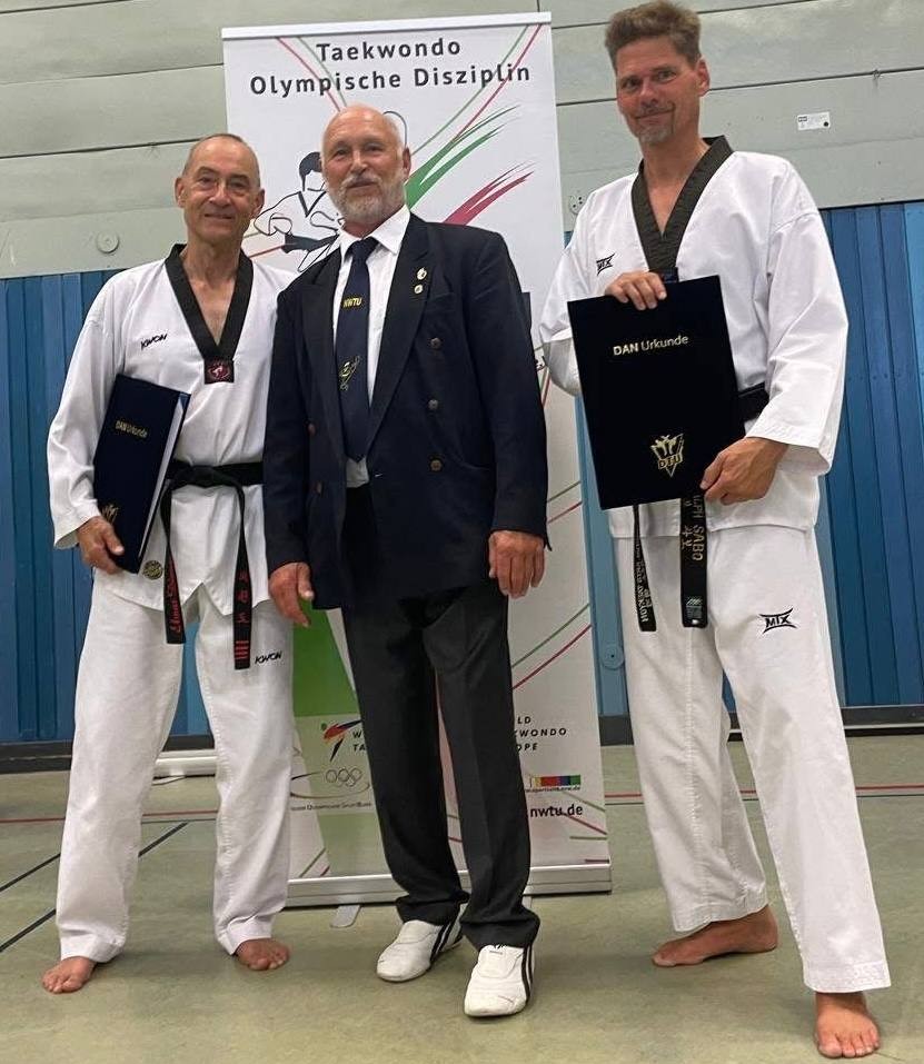 Am 28.06.2025 fand in Viersen-Dülken die Landesdanprüfung vom 1. bis zum 6. Dan statt. Dort stellten sich 39 Prüflinge dem Prüfungsgremium bestehend aus Franz-Peter Erberich (9. Dan), Oliver Friske (8. Dan), Thomas Schneider (8. Dan), Hermann Schnepel (7. Dan) und Dieter Bransch (6. Dan). Unter den Prüflingen war unser Abteilungsleiter und Cheftrainer Elmar Diemer, der seine Prüfung zum 5. Dan ablegte und unser Selbstverteidigungstrainer Ralph Sabo, der seine Prüfung zum 4. Dan ablegte.